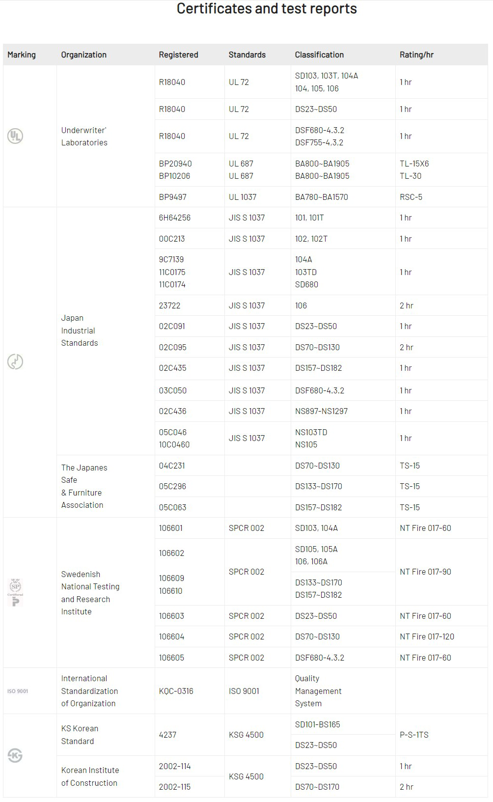 Gövdesi, kapısı, menteşe ve kilit sistemi, her türlü güç ve mukavemete maruz bırakılarak, bağımsız kuruluşlardan test edilmiş ve sertifikalanmıştır.